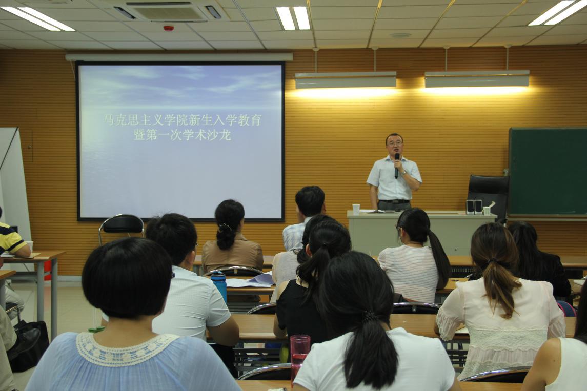 第二位为新生做入学教育的是孙亚忠副院长。孙院长首先着重介绍了马克思主义学院的历史沿革,畅谈学院的发展脉络、发展精神以及演变体制,增强新生们对学院的归属感和荣誉感。(如下图二)